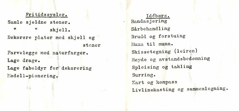 Deretter var det forskjellige aktiviteter. I leirheftet ble det foreslått: bandasjering, sårbehandling, brudd og forstuing, skissetegning, høyde og avstandsbedømming, spleising og takling, surring, kart og kompass og livlinekasting. Vi prøvde nok det meste av dette. Jeg mener i hvert fall å huske et orienteringsløp.