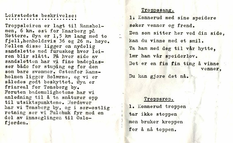 I begynnelsen av sommerferien 1967 arrangerte speidergruppa på Konnerud en troppsleir på Ramsholmen utenfor Nøtterø.